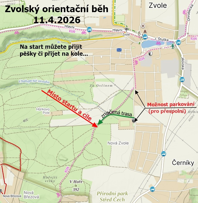 - Místo: Shromaždiště na kraji lesa (cca 500 m západně od sportovního areálu v Nové Zvoli). Cesta bude značena, odkaz na mapy.cz ZDE